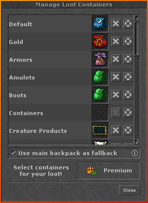 O jogador tem possibilidade administrar cada um de seus containers de loot, que são acessados via Cyclopedia e configurados por hotkey dependendo do contexto do container. E ainda poderá selecionar um container da sua escolha e designá-lo a diferentes categorias base, como: gold, produtos de criatura, anéis e armas. Você poderá designar múltiplas categorias ao mesmo container.